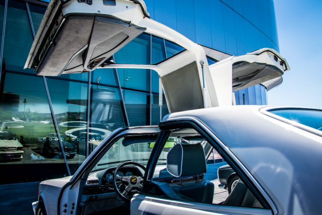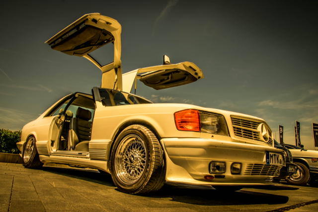 Dort hatte ich die Freude Ralf Weber mit seiner Frau zu treffen. Er hatte eines seiner seltenen Mercedes Fahrzeuge mit am Start. Einen Mercedes 500 SEC der Baureihe W 126. Wie bei Ralf üblich aber keinen normalen sondern einen von noch 3 in Deutschland bekannten Gullwing die damals von Chris Hahn, dem Chef der Hamburger Styling Garage Spezial Karosserien GmbH, kurz SGS genannt, maßgeschneiderten Umbauten zum Flügeltürer.