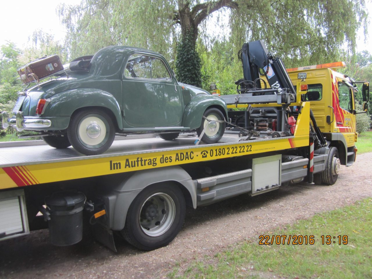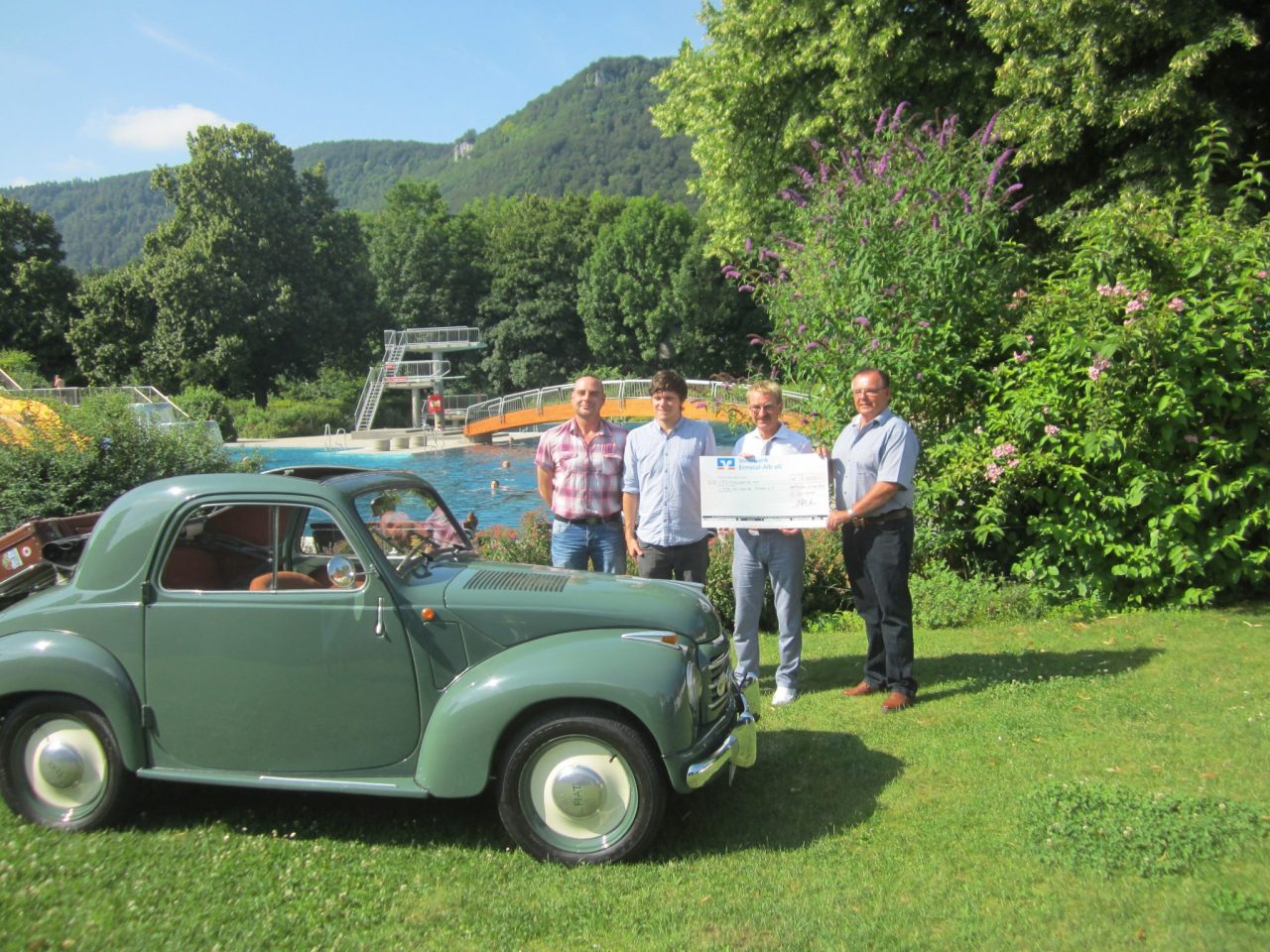 Bei strahlendem Sonnenschein wurde der Topolino vom Titelbild trotz laufendem Betrieb nochmals mitten im Freibad platziert und bei einem kleinen Umtrunk die Spende überreicht. Mein besonderer Dank gilt Klaus Türk, der als Vertreter des Oldtimerstammtisch Altdorf vor Ort war und alles gemanagt hat. Leider hat den Topolino auf dem Rückweg eine Panne (Hardyscheibe) ereilt und der Heimweg in die heimische Garage musste auf dem Abschlepper erfolgen. Wir drücken die Daumen, dass der Topolino bald wieder auf die Straße zurückkehrt.